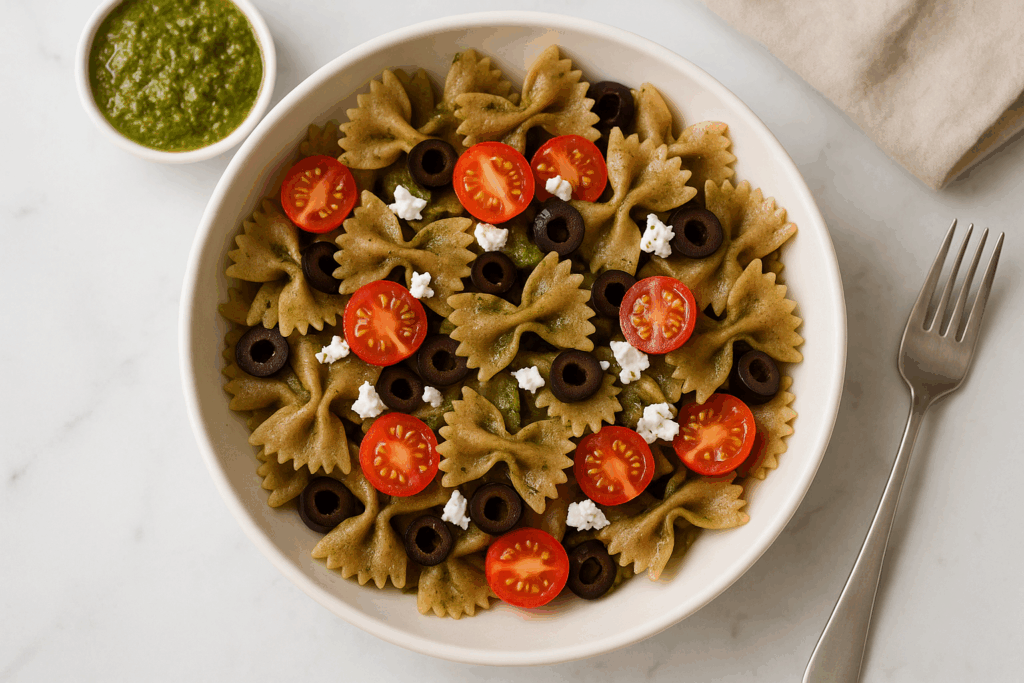 🥒 Farfalle ολικής με πέστο, ντοματίνια & ελιές